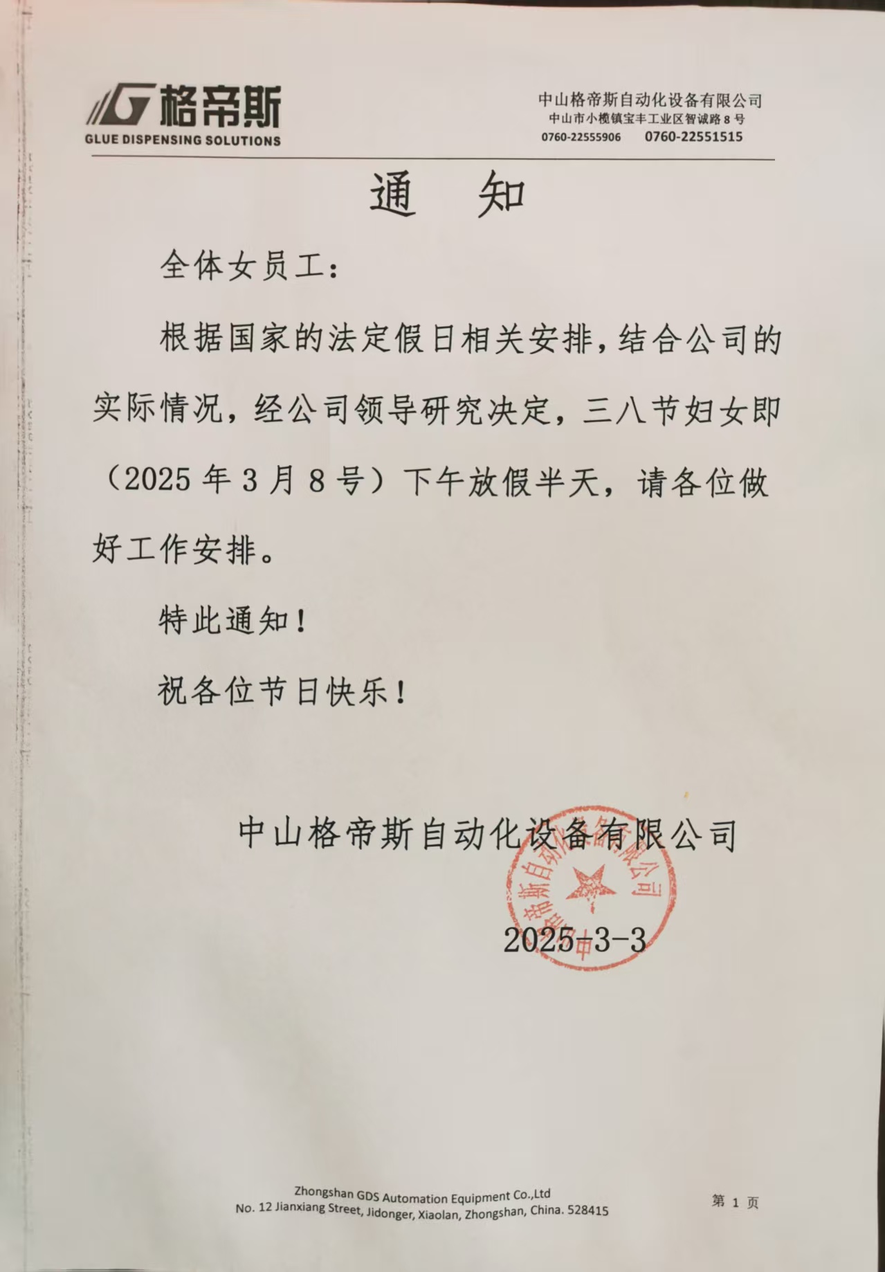 中山91视频黄片下载自动化设备有限公司关于三八妇女节放假安排的通知